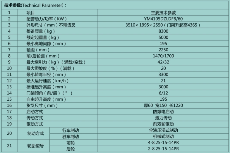 CPCDB50防爆柴油機(jī)平衡重式叉車采用中國(guó)一拖集團(tuán)CPCD50叉車底盤,配裝本公司生產(chǎn)的YM4105DZLDFB防爆電噴柴油機(jī)為動(dòng)力,行走系統(tǒng)采用液力傳動(dòng)變矩器加動(dòng)力換擋變速箱,操作輕松,自適應(yīng)能力強(qiáng),舉升采用雙油缸頂舉,操作平穩(wěn);行車制動(dòng)采用前輪濕式制動(dòng)器,滿足坡道制動(dòng)要求。整機(jī)設(shè)計(jì)合理,結(jié)構(gòu)緊湊,適合于井下叉裝較大部件使用。