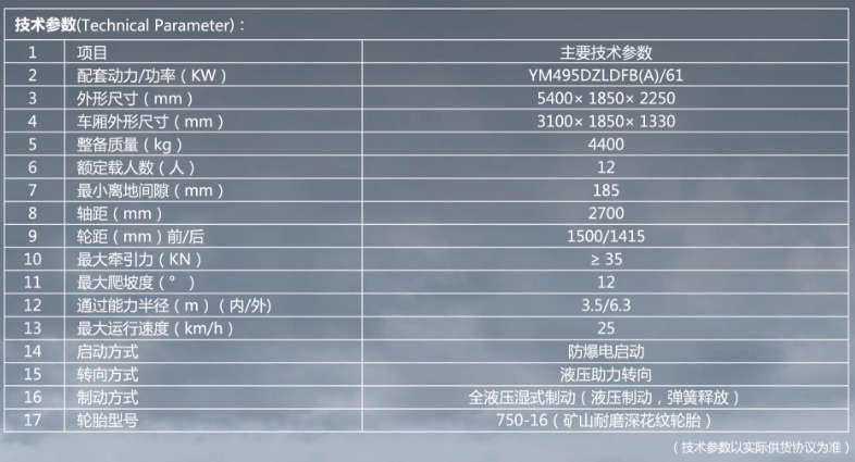 WC12R(A)防爆柴油機(jī)無(wú)軌膠輪機(jī)車配套我公司生產(chǎn)的YM495DZLDFB(A)防爆柴油機(jī)為動(dòng)力、機(jī)械傳動(dòng)、全液壓濕式制動(dòng),液壓助力轉(zhuǎn)向,后開門全封閉運(yùn)人車廂,同時(shí)配有安全門和安全鎖,整車配有減震系統(tǒng),乘坐舒適。適用千煤礦井下載人作業(yè)?!癧”型斷面縱梁,機(jī)車為平頭,采用煤礦工程車專業(yè)加強(qiáng)底盤,具有結(jié)構(gòu)緊湊、駕駛舒適、乘坐方便、爬坡能力強(qiáng)、運(yùn)輸效率高等優(yōu)點(diǎn)。